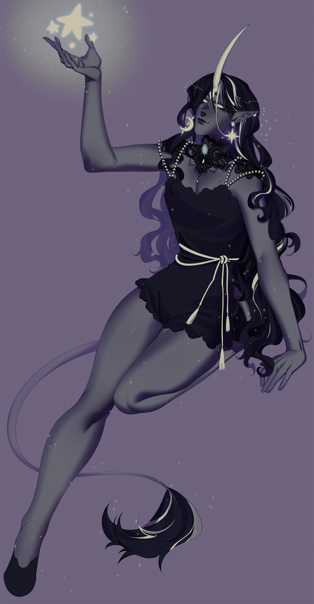 He usually wears a large dangly crescent earring in his right ear, and a star in his left ear. His ear tips are pierced with little diamond star studs.